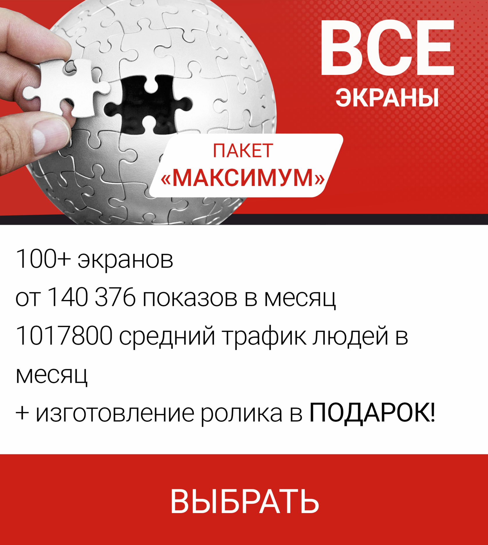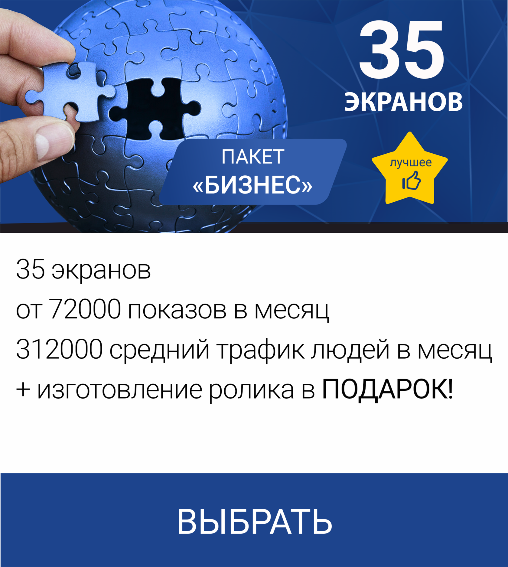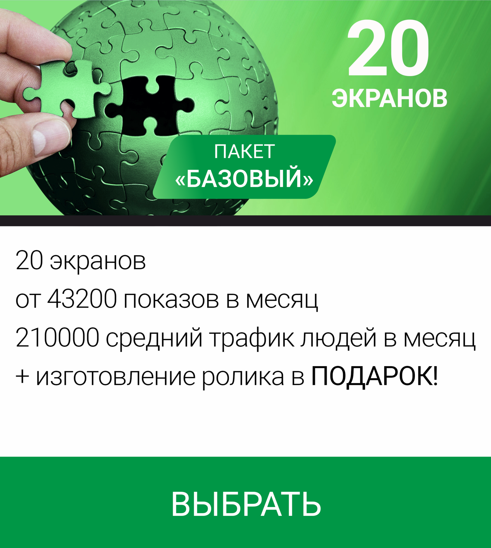 Пакетные предложения позволяют обеспечить территориальный охват актуальной для вас целевой аудитории, либо задействовать все мощности нашего ресурса видеорекламы по оптимальной цене. Выберите подходящее для вас количество экранов и экономьте до 119 700 ₽ в месяц!
